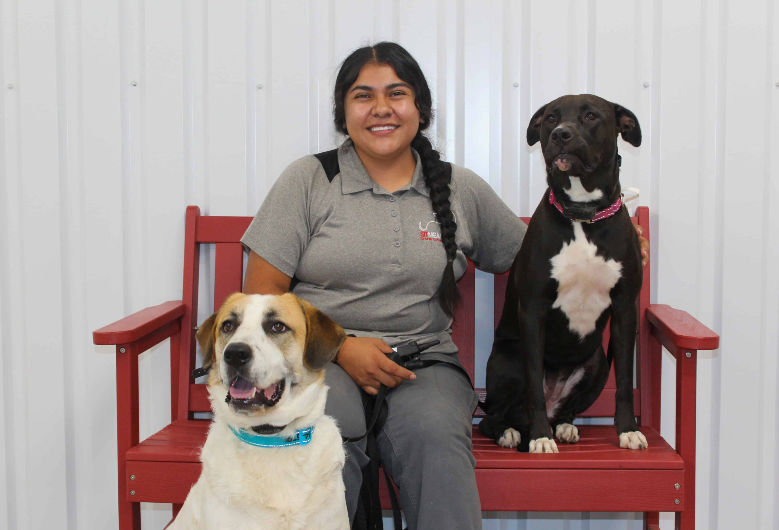 Britnee is one of the newest faces on our training team, and she’s already making a big impact! Before joining us, she was a gymnastics coach—so she’s no stranger to teaching and motivating her students. Now, instead of flips and routines, she’s helping dogs master one-on-one lessons and group class drills. You’ll also see her out and about when we’re socializing dogs in town.